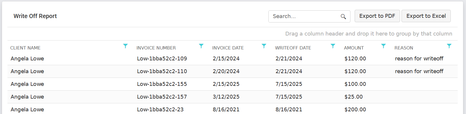 View a detailed report of all your invoice write offs. Locate any specific specific write off that was issued. Each record in this report contains the following information